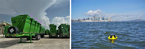 Left: a Wedgworth Killebrew-style fertilizer trailer. The trailer has four large fertilizer bins. Our monitor (little white box by the pink arrows) tracks how much fertilizer is left in each bin and where the trailer is in Florida. Right: a moored Sofar Ocean buoy. Near-shore buoys can take advantage of lower-cost cellular data instead of expensive satellite data.