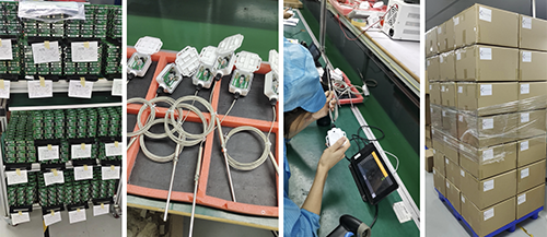 Thousands of Geocene Temperature Dots are being born! Left to right: bare PCBs, cases awaiting batteries and closure, functional testing of wireless communications and temperature sensing, and a pallet of just half the Dots! Once we had all the parts, it only took our team in China about one week to make all 3300 of these. Amazing.