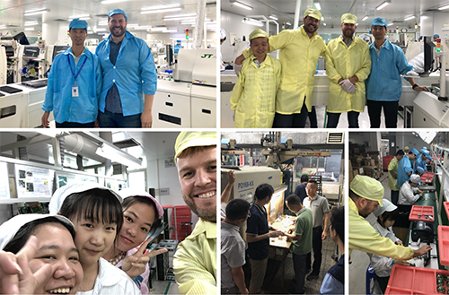 Clockwise from top-right: (1) I’m wearing the biggest coat in the PCB factory (Chinese size 5XL, but still rocking Tommy Boy vibes), (2) the next day the factory staff bought Skot, Hall, and me unique yellow coats that actually fit, (3) Skot assisting and supervising the final assembly line, (4) our injection molding team working out some issues with sinks in the plastic case, and (5) Skot smiling with some of the final assembly staff that build the Dots!